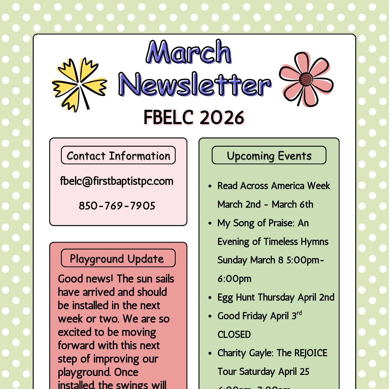 To provide child care for working families as an outreach ministry of First Baptist Church Panama City.